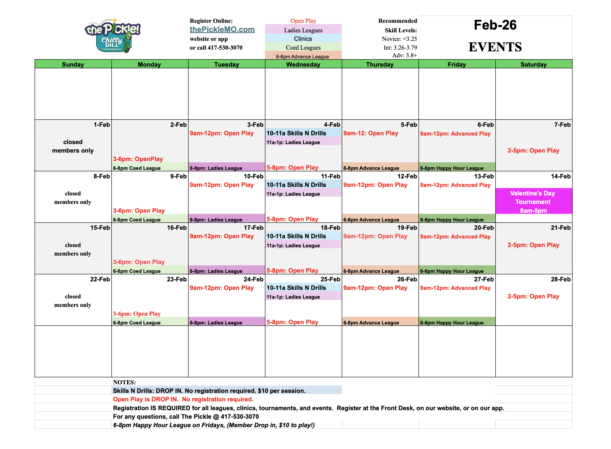 - Group Activities: Drop in events like Open Play, Skills & Drills, etc.